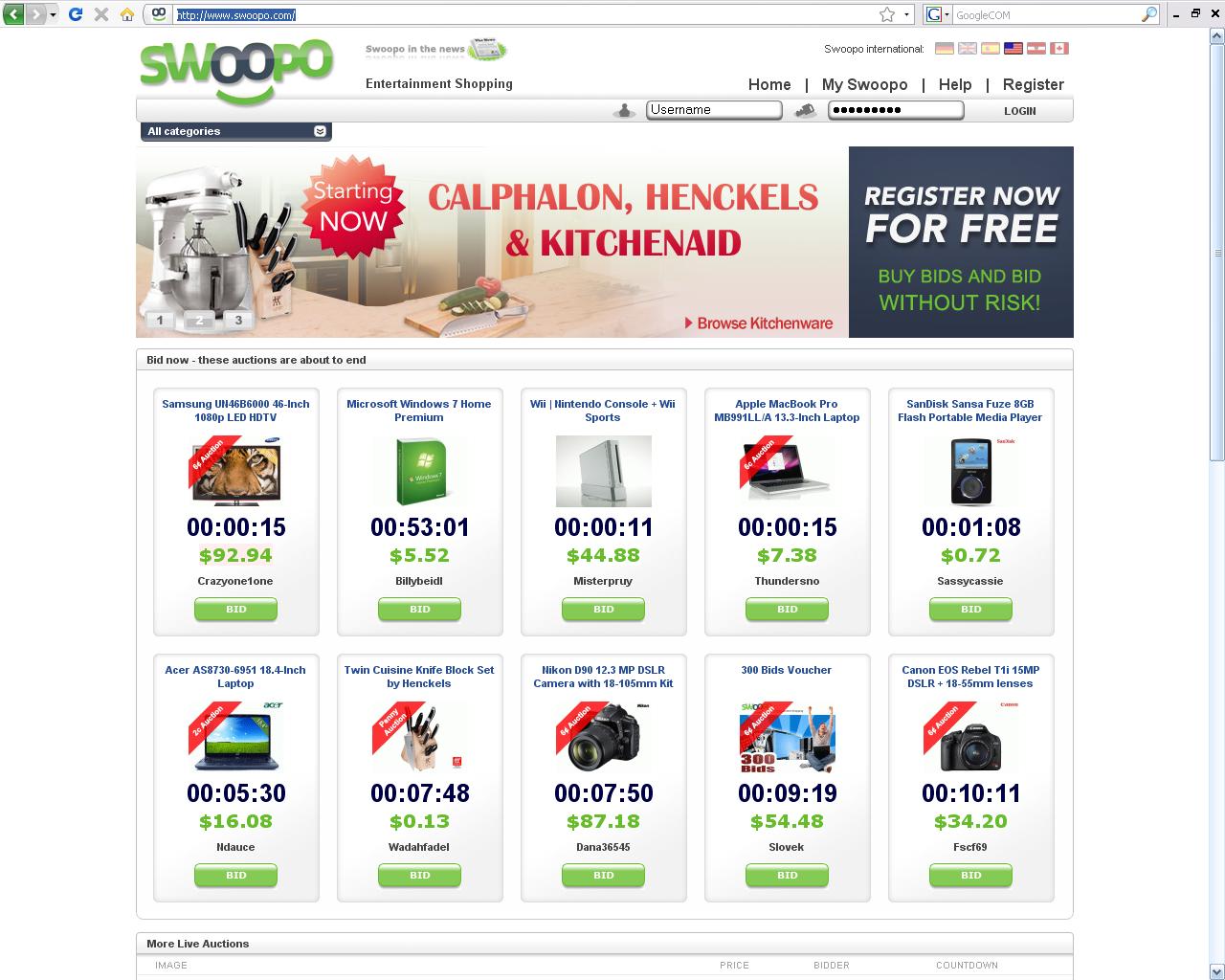 Taking and expanding the reverse auction website concept, this website offers registered the chance to bid on auctions and pay a fraction of the retail price. The website owner has the ability to control all aspects of the website, from adding and editing auctions, to refunding bids and suspending users.